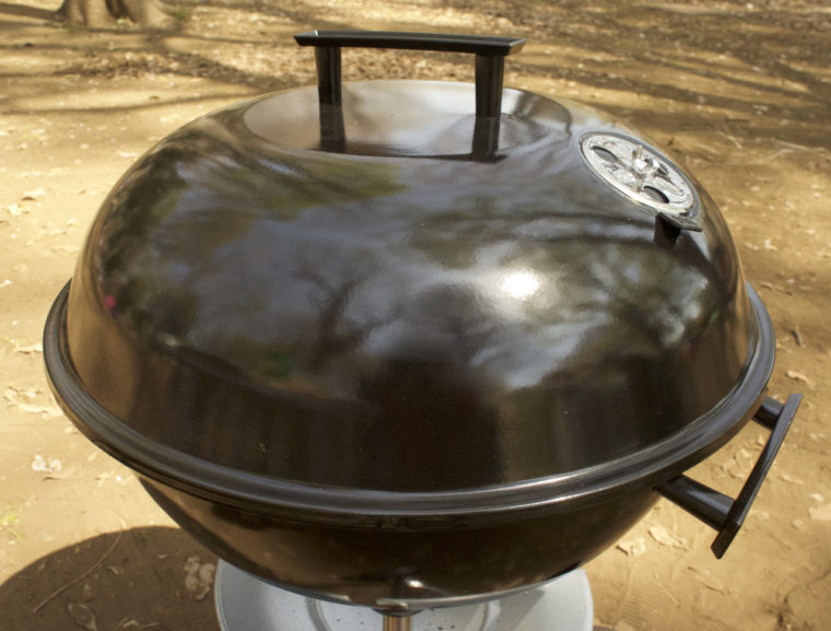 3)バーベキューコンロの網にのせ、蓋をして焼く。途中上下を返す。