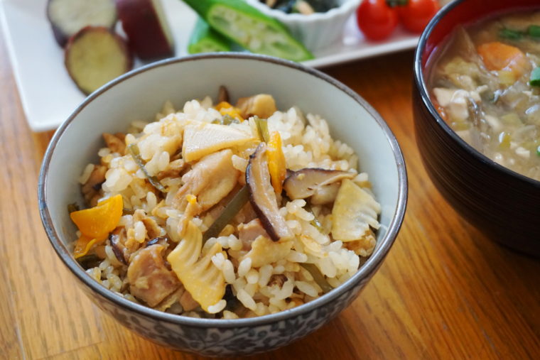 具材をごま油で炒めて味付けしてから、合わせ出汁でご飯と一緒に炊きげます。出汁を取った昆布と干し椎茸の旨みと栄養も丸ごと味わえる炊き込みご飯です。