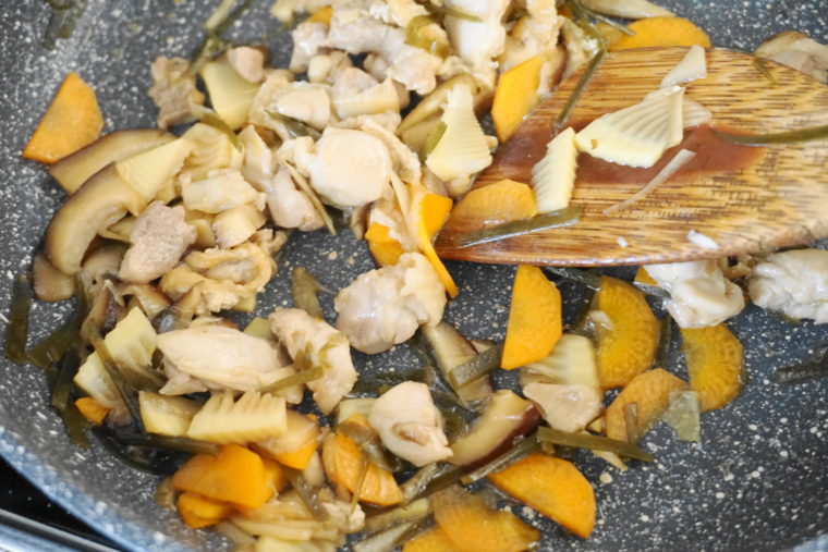 1)炊く1時間以上前に米を洗って、ざるに入れ、水を切っておく。2)鶏モモ肉やたけのこは食べやすい大きさに、油あげは短冊切り、にんじんは半月かいちょう切り、ごぼうはささがきにして水にさらしてあく抜きをする。出汁を取った昆布や干し椎茸も取り出して細切りにする。3)フライパンにごま油を入れ、具材を炒める。さとう、しょうゆ、塩を加えて水分が少なくなるまで炒める。