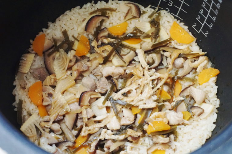米・・・1合鶏モモ肉・・・1/4枚油あげ・・・1/4枚ニンジン・・・3cm(20g)ごぼう・・・3cm(5g)たけのこ・・・20g昆布・・・1/2枚(水出汁で使用したもの)干し椎茸・・・1枚(水出汁で使用したもの)ごま油・・・大1さとう・・・大1/2しょうゆ・・・大1塩・・・小1/2水出汁・・・180mL