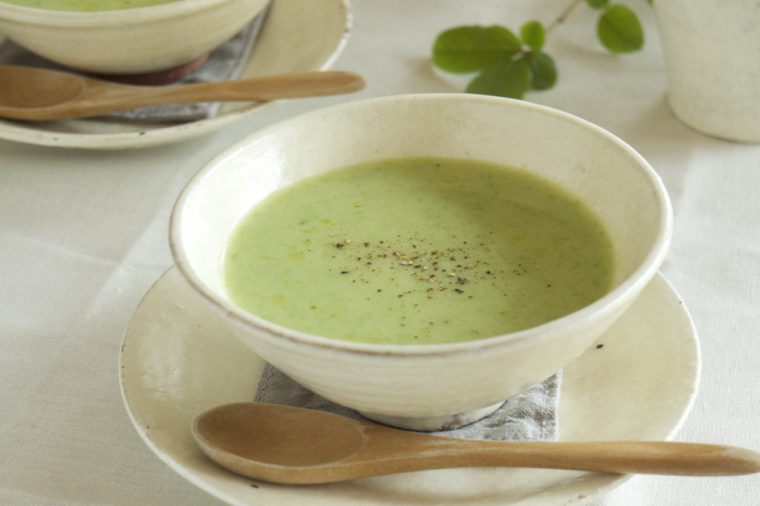 かつおと煮干しのだしとアスパラから出るうまみの相乗効果でぐっとおいしく、 和風の味わいでほっとする、体に優しいスープです。