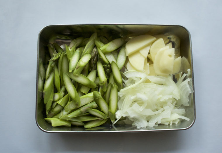 1)アスパラは根元を落とし、ピーラーで根元に近い部分の皮をむき、5mm 厚 の斜め切りにする。じゃがいもと玉ねぎは薄切りにする。