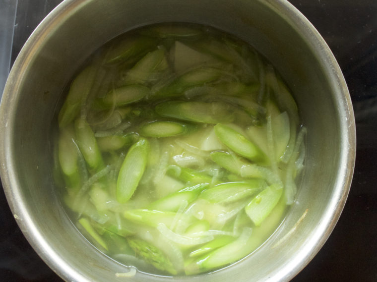 2)鍋を熱し、オリーブオイルを入れ、玉ねぎを中火で炒める。透き通ってきた らじゃがいも、アスパラを入れて、油が回ったら水出汁を入れ、 蓋をして2〜3分煮る。