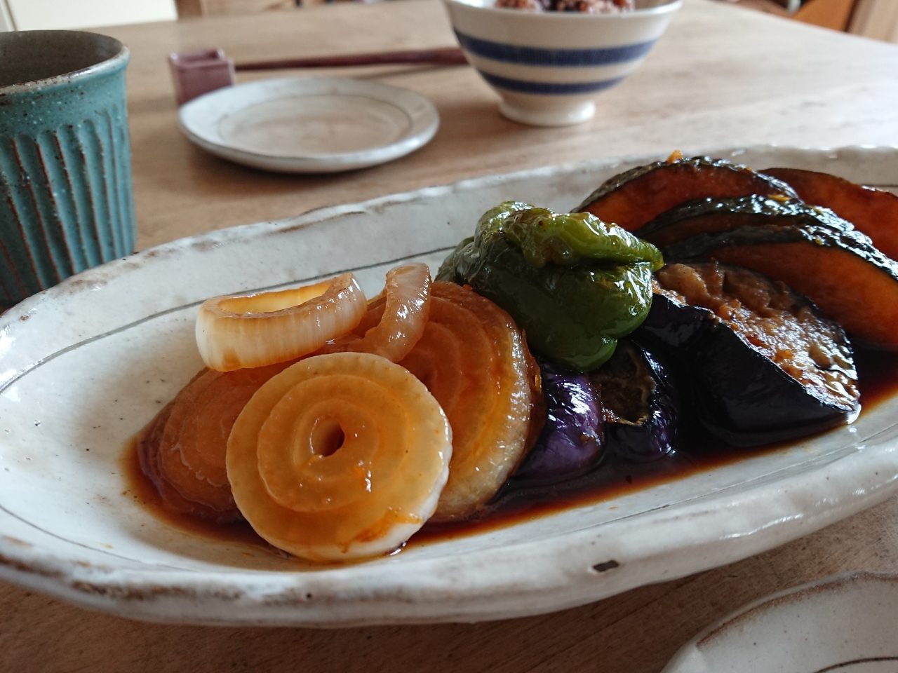 1)かぼちゃは7~8ミリの薄切り、新玉ねぎは1センチ程の輪切り、ピーマンは縦に半分に、ナスは1センチの輪切りにする。2)鍋に、だし、しょうゆ、みりん、さとうを加えてひと煮たちさせる。3)1)の野菜を170度くらいの少ない油で揚げ焼きにし、2)に漬ける。