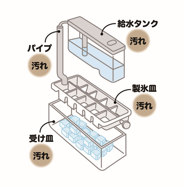 冷蔵庫内では、自動製氷機の水タンクや製氷装置内の汚染というのも軽視できません。水タンクは概ね、氷の衛生を保つ意味で水道水(塩素入り)を充填することを推奨されているものなのですが、「美味しい氷を作りたい」がために湯冷ましやミネラルウォーターを良かれと使用している人が少なくないことも問題です。