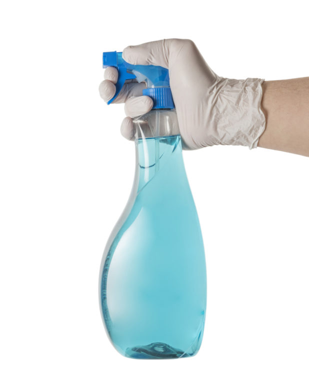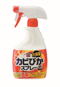 ④すみやかにカビ取り剤(次亜塩素酸ナトリウム)スプレーを吹き付け、しばらく置いたのちにすすいでおく