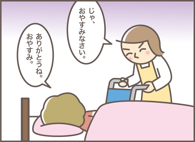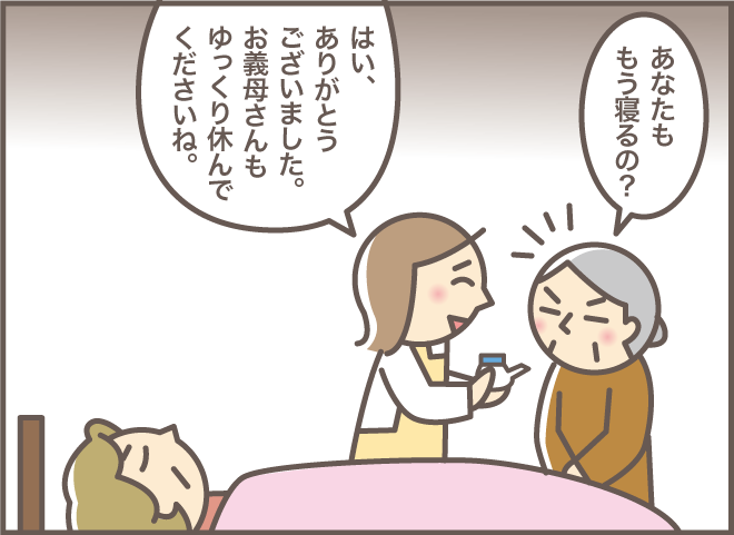 認知症のお義母さんと車椅子のおばさんをそれぞれの寝室に連れていくと、嫁の1日の介護は終了。