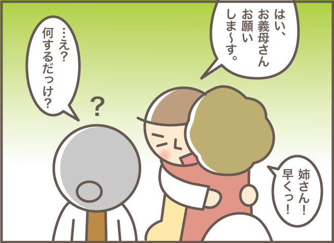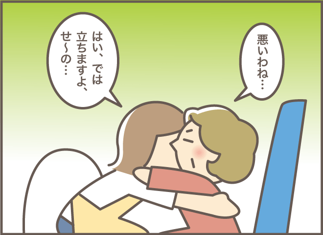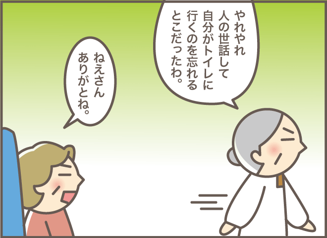 私がおばさんをポータブルトイレの前に立たせた後 お義母さんがおばさんのパンツを下げる係だけれど 毎回、それを忘れてしまって大騒ぎで説明することになる。しかし無事、トイレ介助が済むと…