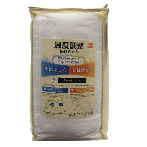 夏は涼しく冬は暖かい温度調整掛け布団。中綿に旭化成株式会社が開発した高性能な「アクアミュー®」を採用。そのため夏は湿気をどんどん吸湿し放出するため、ムレにくく爽やか。また冬は吸湿発熱効果により暖かく、ムレにくい。洗濯機での丸洗い可。