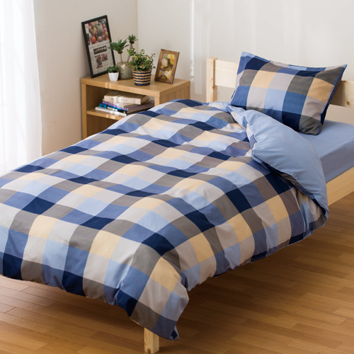 柔らかな肌触りで取替簡単な布団カバー。ファスナー、6か所スナップボタン、4か所スリット。上部2か所スリットはスリット閉じるボタン付き。サイズ:幅1500x奥行2100mm。素材:ポリエステル100%。他柄のご用意あり。