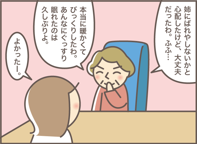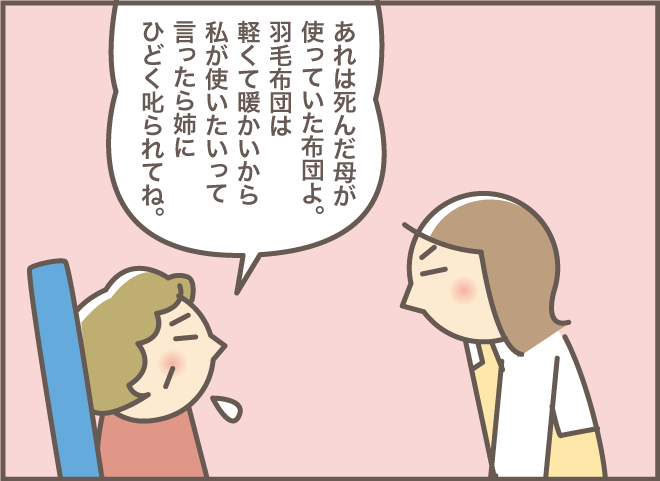 これからの季節、高齢者にとって軽くて暖かい布団は重要ポイント。 きっと天国のお母さまも、娘が使うことを笑顔で承知していると思います。