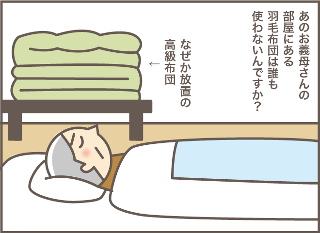 お義母さんの枕元に積んである羽毛布団を別室に移動させることに成功。