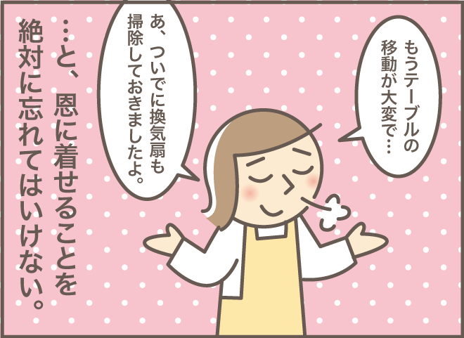 たしかに、電灯の傘も換気扇もホコリがうっすらあるだけで簡単にきれいになりました。台所が汚れるのが大嫌いなお義母さんたちは「油料理禁止」のため古い台所ですが、いつもピカピカでした。 たしかに「大掃除なんかしたことない。」は嘘ではないようですがそれはそれとして掃除をした嫁は…