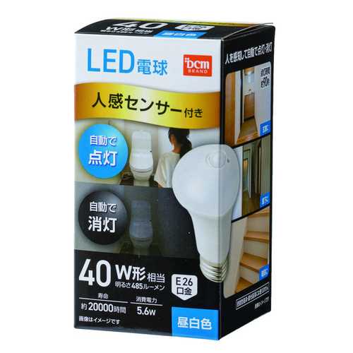 人に反応して自動で点灯!人感センサー機能搭載のLED電球。人を感知して自動で点灯・消灯します。廊下や階段やトイレや玄関などに最適。長寿命約20000時間で、ランプ交換の手間が少ないLED電球。