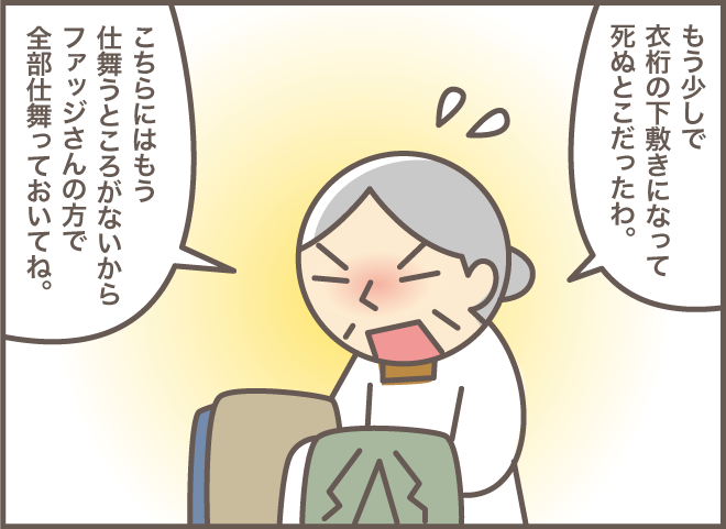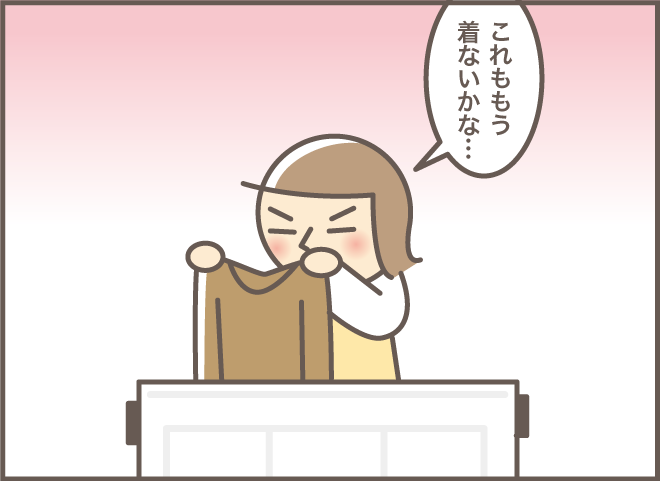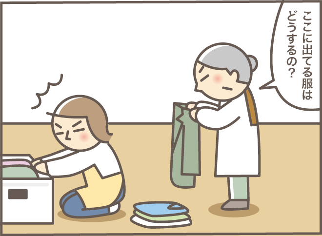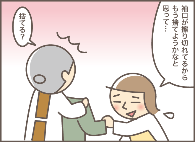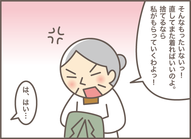 大正生まれのお義母さんは、服に限らず物を捨てることがなかなかできません。特に洋裁が得意なので、古着は修繕したりリメイクしたりして大切に着続けることを良しとしていました。嫁からもらった服は自室の衣桁にかけられ、修繕されるのを待っていました。