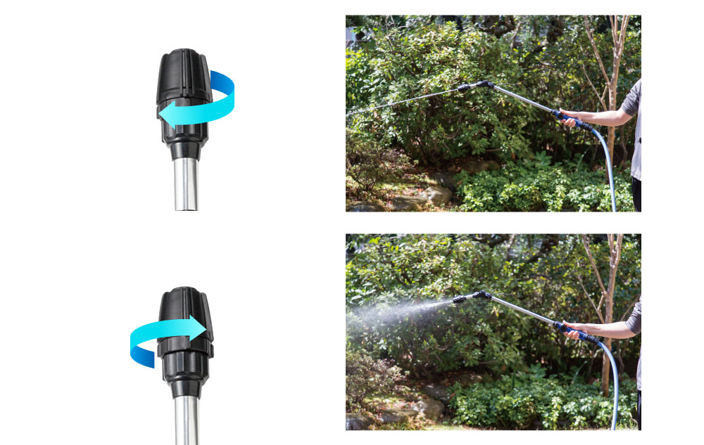 ノズルの先端を回すことで水形が変えられます。ジェットモード強力な水流でピンポイントで汚れを洗浄できます。頑固な汚れや細部の洗浄に適しています。ワイドモード広範囲を一度に洗浄でき、外壁や車の洗浄など広い面積の洗浄に適しています。