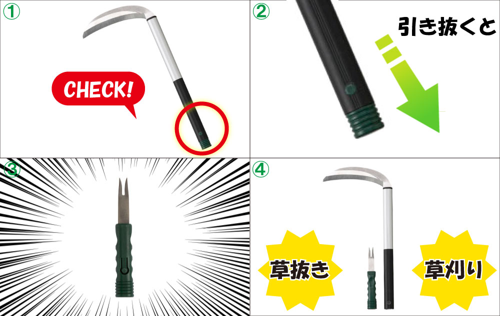 草刈りの際、成長した長い草はすぐに刈ることができるが、生え始めや短い雑草は刈りにくく、抜く方が簡単。そのため鎌と草抜きの2つの道具が一緒になっていると便利だと思った。