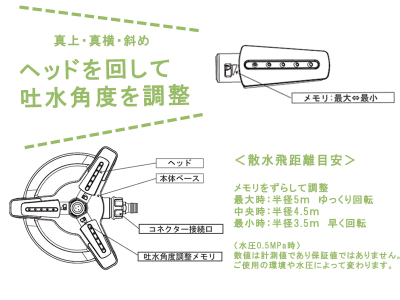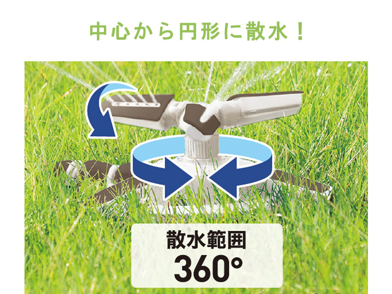 360°散水可能で、中心から放射線状に、円形に広く散布します。水流パターンは真上、斜め、横と3種類調整できます。散水したい場所や植物によって使い分けることができます。
