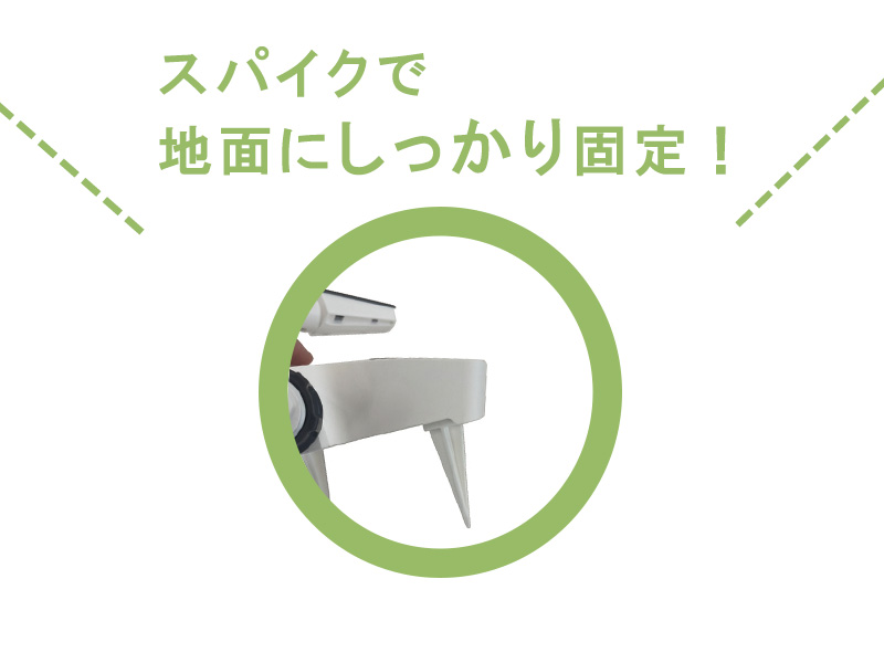 裏面にスパイクがついているので、地面にしっかりと固定します。外で使うので、耐久性や安全性は重要!風が吹いたり、雨が降ったりした際にも簡単に飛ばされることはありません。