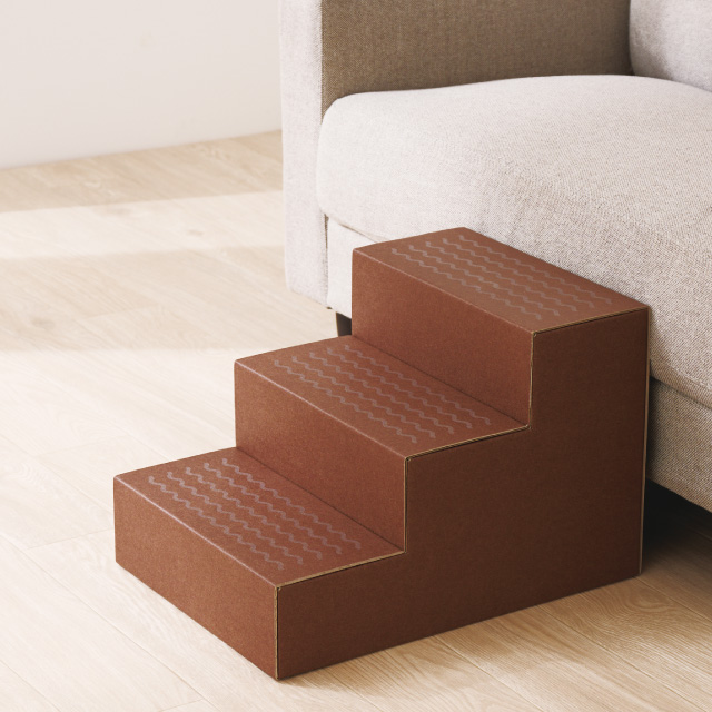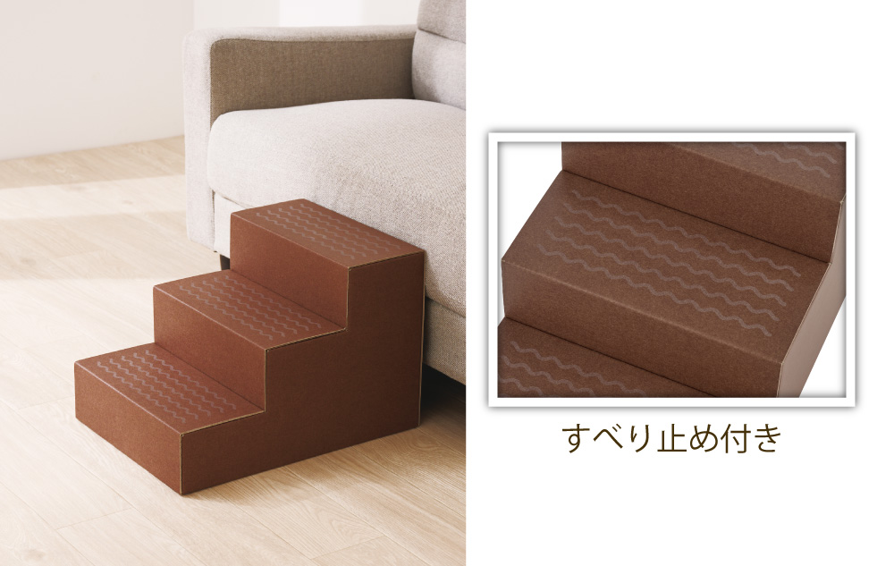 段ボール素材で軽量ながら、耐荷重約 10kgと丈夫です。高さ約 30cmとソファやベッドに上がるステップとしてちょうど良い高さです。ステップ面、底面にすべり止めが付いているのも安心なポイントです。