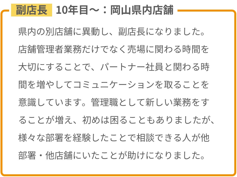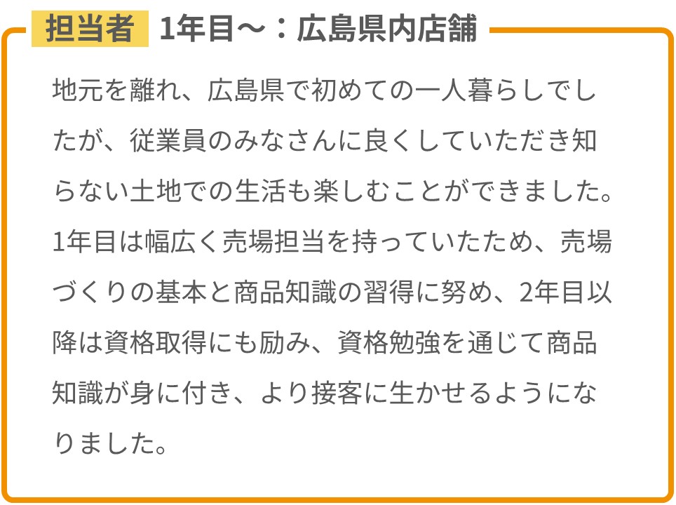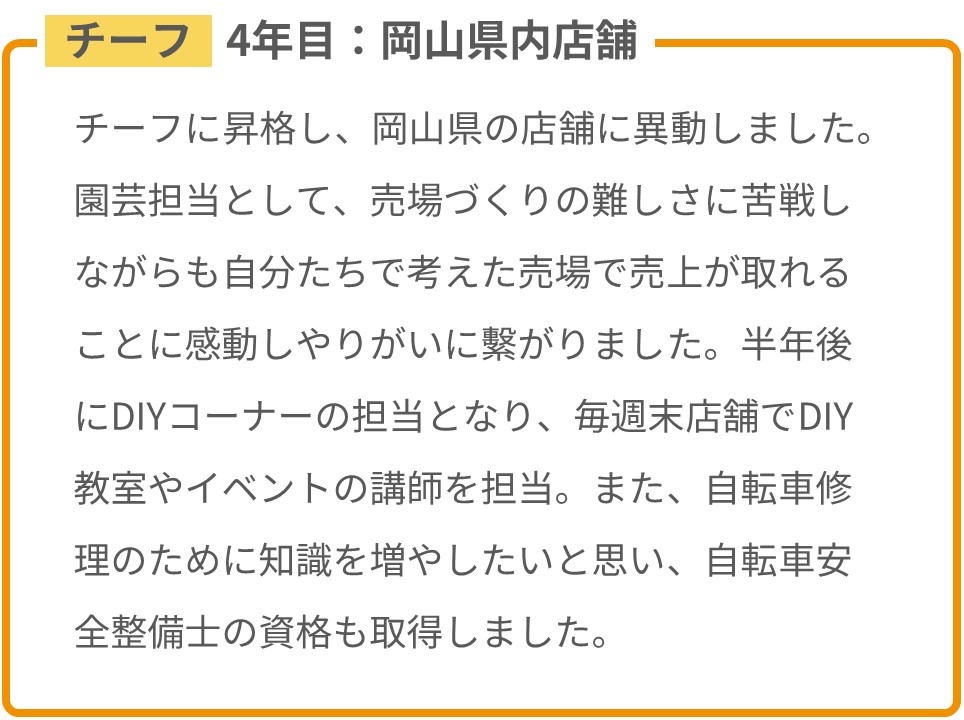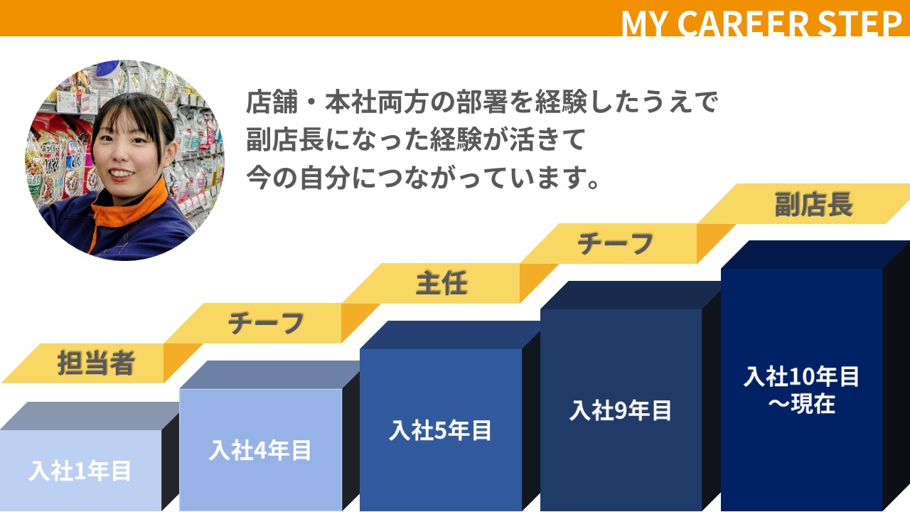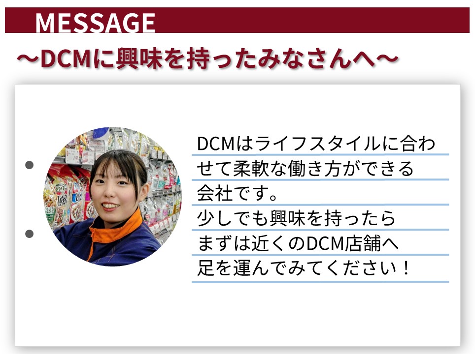 学生時代接客に関わるアルバイトをしていた際に、接客が好きだと感じお客さまに「ありがとう」と言われることがやりがいにつながると感じて、地元でよく利用していたDCMに興味を持ちました。また会社説明会で採用担当者の方がやりがいを持って働いている話を聞いて私も一緒に働きたいと思ったことがきっかけです。